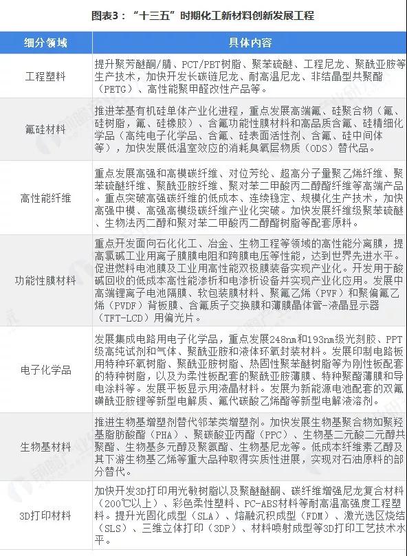 为改变当前现状,我国出台了一系列政策支持化工新材料发展。如在“十三五”时期,将实施多项创新发展工程,提升工程塑料工业技术,加快开发高性能碳纤维及复合材料、特种橡胶、石墨烯等高端产品,加强应用研究;提升为电子信息及新能源产业配套的电子化学品工艺技术水平;发展用于水处理、传统工艺改造以及新能源用功能性膜材料;重点开发新型生物基增塑剂和可降解高分子材料。